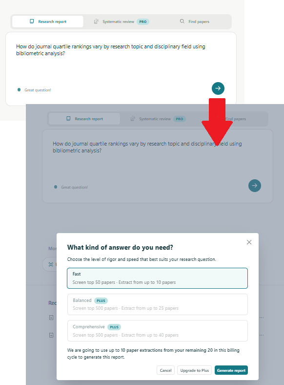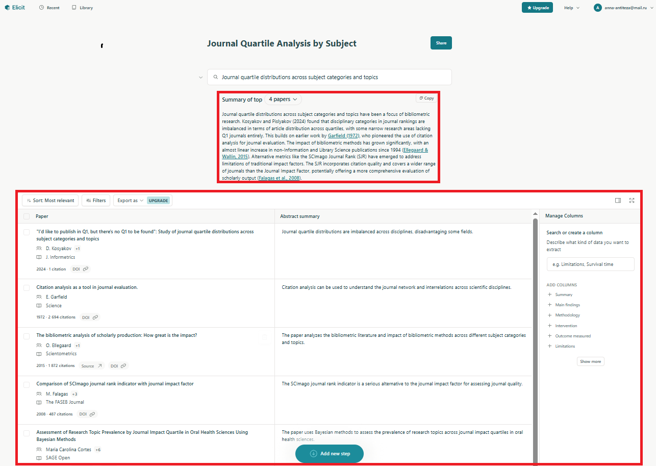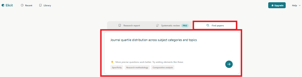 With the Research Report tool, you can enter your research question, and Elicit will automatically generate a detailed answer. If your question is not accurately formulated, the service will suggest a better version to increase the results relevance.