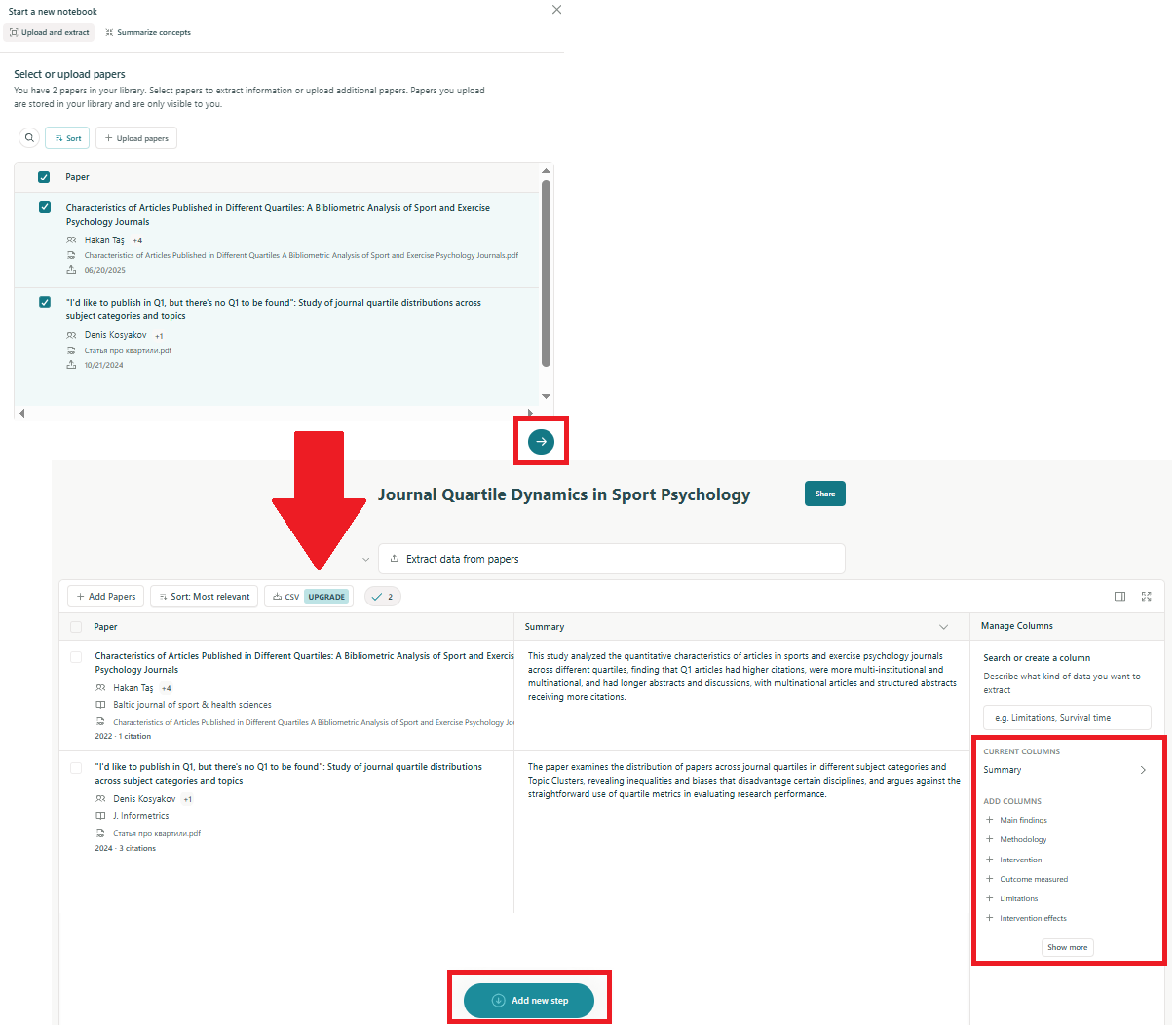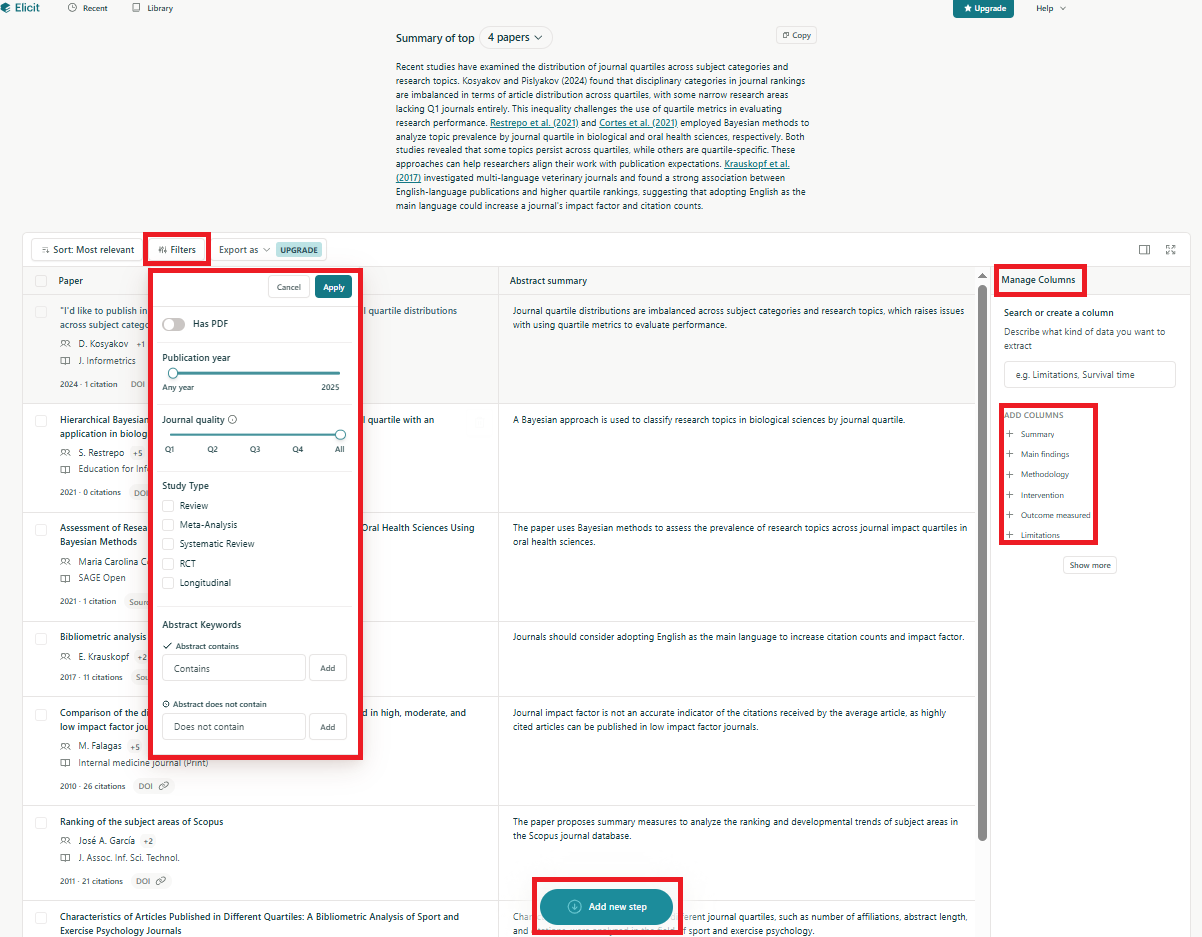 Elicit will automatically generate a table from these articles, which you can then use for your research , for summarizing information, or conducting an in-depth analysis of your topic. You can add new columns, perform additional steps, and even view articles within the chat interface.