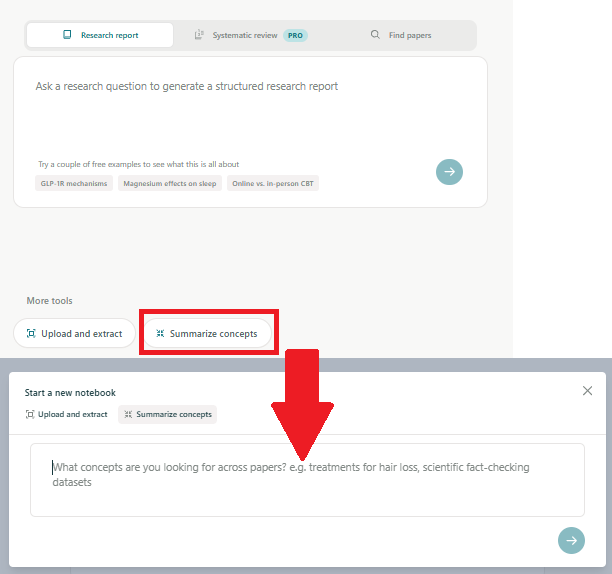 - Summarize Concepts (ссылка на блок текста) — get concise summaries of research concepts based on available literature.