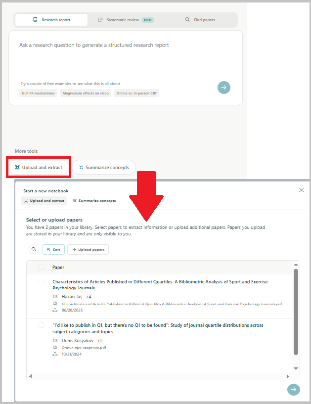 First, Elicit will find the articles related to your topic. Then, the program will analyze their content to identify common concepts. Before showing the results, the system will remove all the detected duplicates.