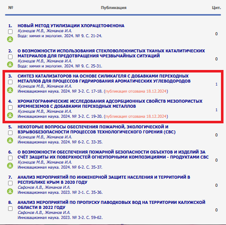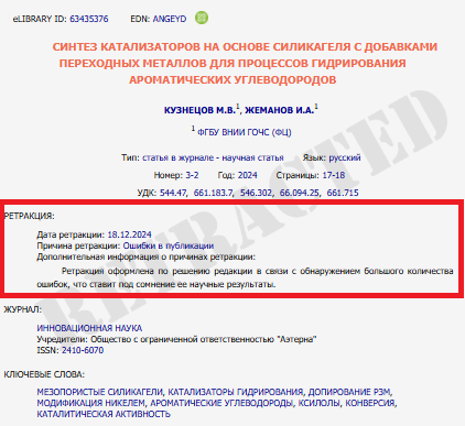 In Russia, the database of retracted publications is available on the website of the Ethics Council of the Russian Academy of Sciences (DB RS ANRI) and in the Scientific Electronic Library eLIBRARY.RU. As of December 2024, the latter contained 5094 records. In the eLIBRARY.RU interface, retracted publications are specifically marked (see the image below) and are not included in the calculation of bibliometric indicators. A retraction mark is also added when generating a reference.