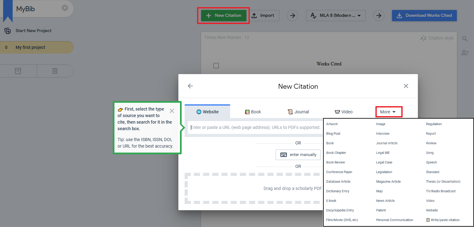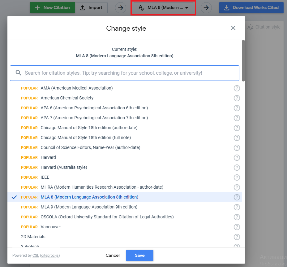 2.Выбираете стиль цитирования — MyBib поддерживает более 9 000 форматов, включая: